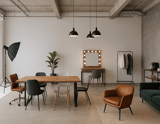 Um loft completo com cama, cozinha e sofá, perfeito para ensaios lifestyle, vídeos e produções autorais. A vista para o Eixo Monumental de Brasília torna o ambiente ainda mais inspirador, com luz natural e clima intimista para criar com liberdade e autenticidade.